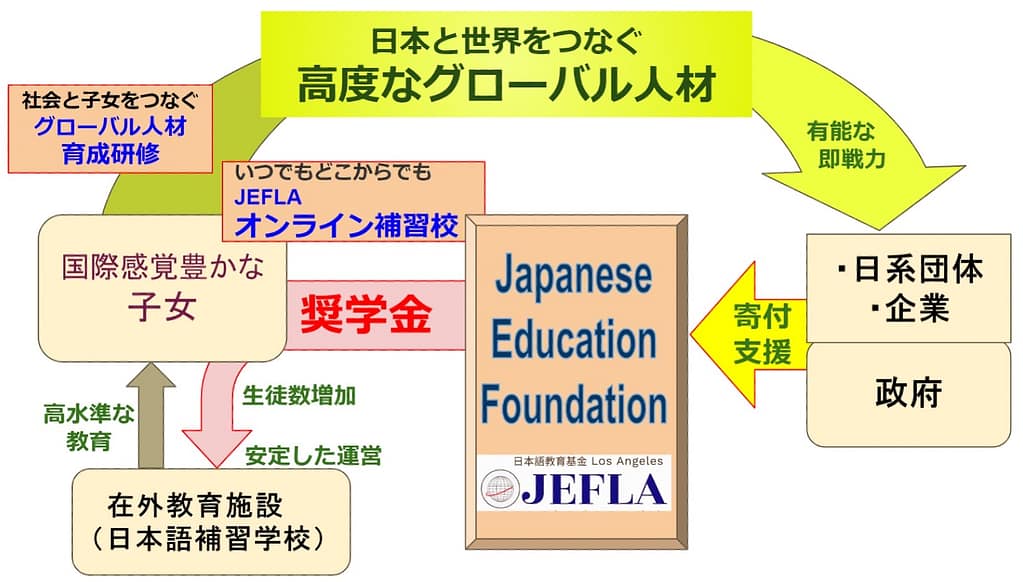 日本語教育基金 Japanese Education Foundation LAは、海外在住子女が将来有能なグローバル人材として活躍するための支援を行う非営利団体です。全ての海外在住子女への日本語教育を推進すると同時に、子女と企業をつなぎ、日本企業の活躍と、日本の国際力強化を目的としています。